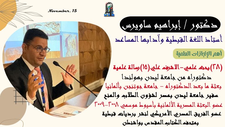 دكتور / إبراهيم قديس إبراهيم ساويرس أستاذ اللغة القبطية وآدابها المساعد —————————————- يمكنكم التعرف علي كافة المؤتمرات والفاعليات العلمية الخاصة بسيادته وبالدراسات القبطية...