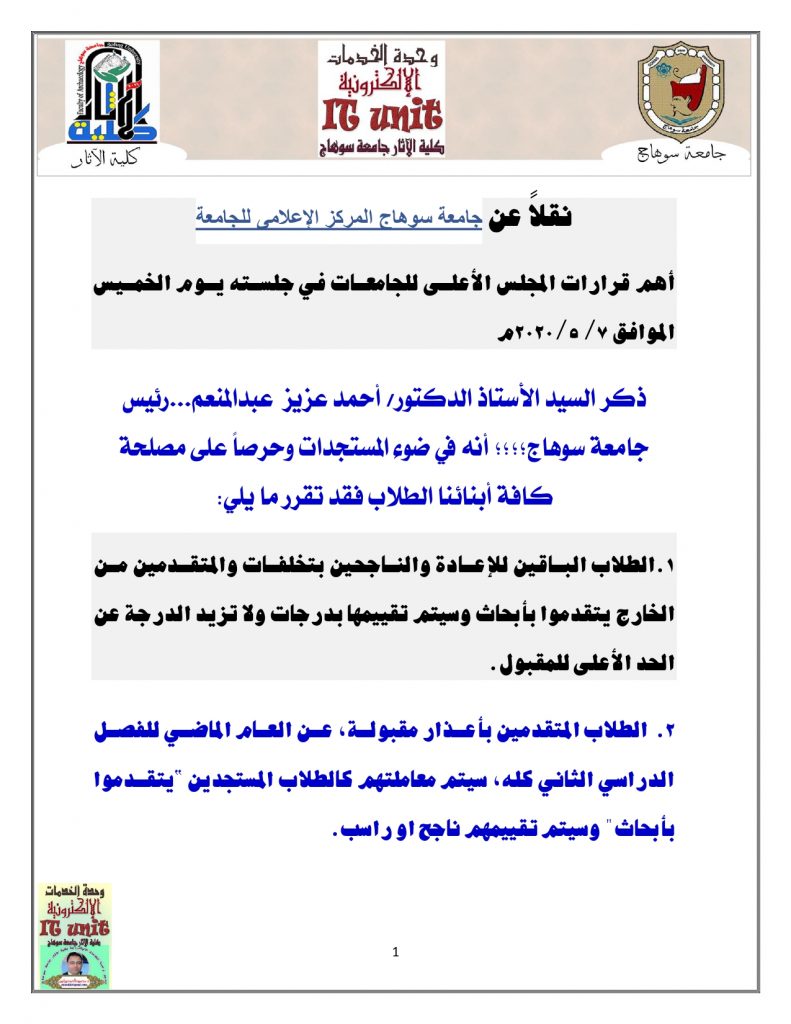 نشر على 8 مايو، 2020نشر في أخبار الكلية،أخبار قسم الآثار الإسلامية،أخبار قسم الترميم،اخبار قسم الآثار المصرية أهم قرارات المجلس الأعلى للجامعات في جلسته يوم الخميس الموافق 7/ 5/2020م هام لطلاب التخلفات والمسجلين من الخارج أهم قرارات المجلس الأعلى للجامعات في جلسته يوم الخميس الموافق 7/ 5/2020م هام لطلاب التخلفات والمسجلين من الخارج تصفّح المقالات هام لجميع الطلاب رابط المنصة الالكترونية لرفع أبحاث طلاب جامعة سوهاجتنبيه هااام وعاجل لطلاب كلية الآثار اترك تعليقاً إلغاء الردلن يتم نشر عنوان بريدك الإلكتروني. الحقول الإلزامية مشار إليها بـ *التعليق * الاسم * البريد الإلكتروني * الموقع الإلكتروني احفظ اسمي، بريدي الإلكتروني، والموقع الإلكتروني في هذا المتصفح لاستخدامها المرة المقبلة في تعليقي.