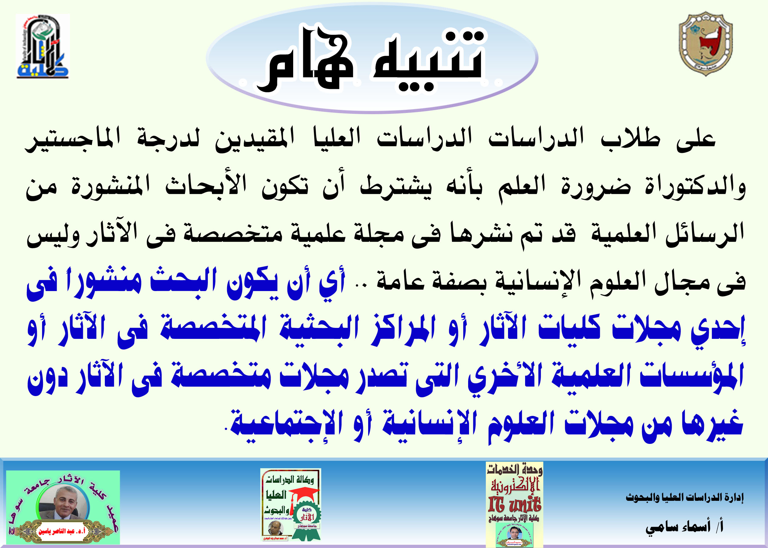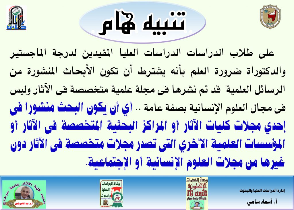 على طلاب الدراسات الدراسات العليا المقيدين لدرجة الماجستير والدكتوراة ضرورة العلم بأنه يشترط أن تكون الأبحاث المنشورة من الرسائل العلمية قد تم نشرها فى مجلة علمية متخصصة فى الآثار وليس فى مجال العلوم الإنسانية بصفة عامة .. أي أن يكون البحث منشوراً فى إحدي مجلات كليات الآثار أو المراكز البحثية المتخصصة فى الآثار أو المؤسسات العلمية الأخري التى تصدر مجلات متخصصة فى الآثار دون غيرها من مجلات العلوم الإنسانية أو الإجتماعية.