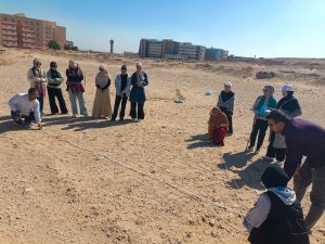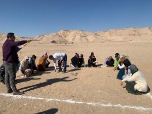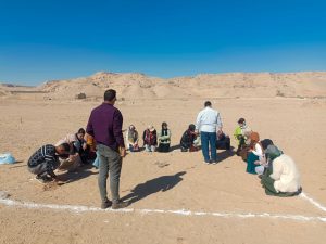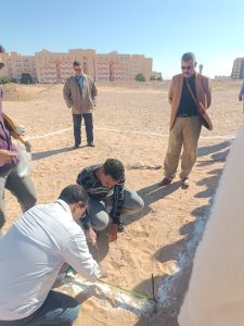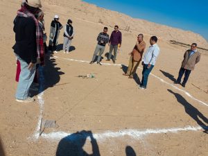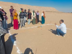 *كيفية تقسيم الموقع الأثري عن طريق المخطط الشبكي لتنظيم العمل فيه؛ وقد تم التدرب على كيفية التقسيم عن طريق عمل مربع بتنفيذ نظرية المثلث قائم الزاوية لفيثاغورث، ثم تم التدريب على تنفيذ طريقة ضرب الخيط.