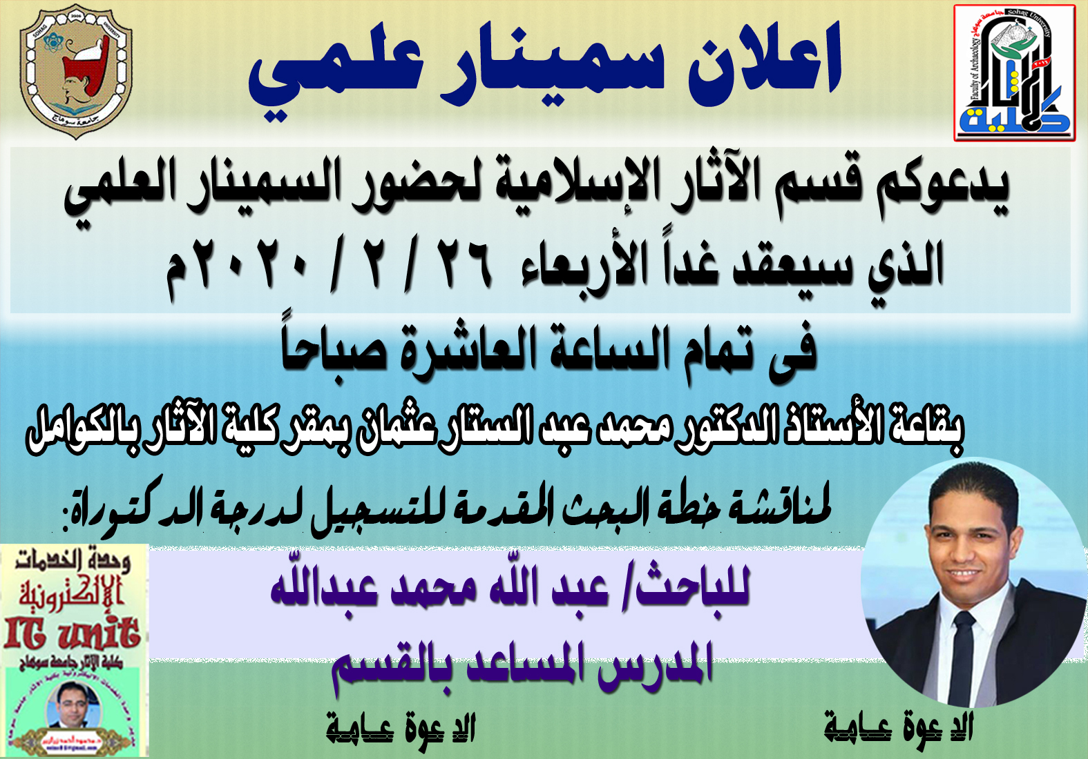 اعلان سمينار علمي لمناقشة خطة بحث للتسجيل لدرجة الدكتوراه بقسم الآثار الإسلامية
