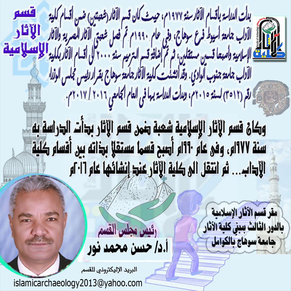 يطيب لي أن أرحب بحضراتكم في موقع قسم الآثار الإسلامية كلية الآثار جامعة سوهاج؛ الذي يُعد من أعرق أقسام الآثار الإسلامية في مصر والعالم العربي؛ فقد بدأ كشعبة ضمن قسم الآثار بكلية الآداب سنة 1977م، ثم أصبح قسماً مستقلاً عام 1990م، فأحد أقسام كلية الآثار جامعة سوهاج عند إنشائها وبداية الدراسة بها فى العام الجامعي 2016 / 2017م.