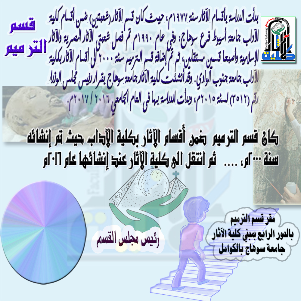 ويقع مقر القسم بالدور الرابع بمبني كلية الاثار جامعة سوهاج بالكوامل .
