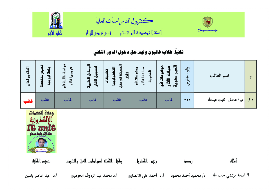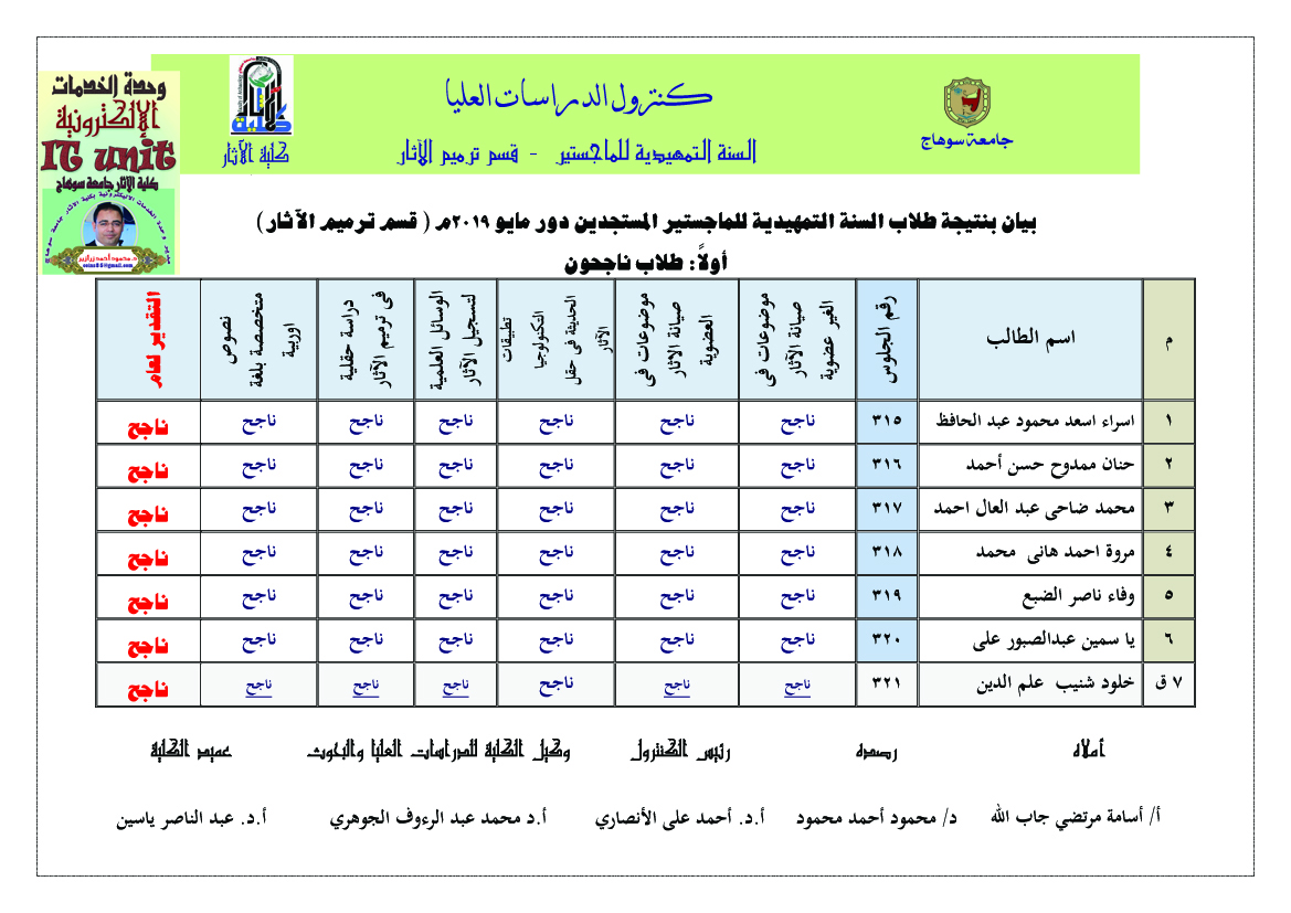 نشر على 19 يوليو، 2019نشر في أخبار الكلية،أخبار قسم الترميم بيان بنتيجة طلاب السنة التمهيدية للماجستير المستجدين دور مايو 2019م ( قسم ترميم الآثار) أولاً: طلاب ناجحون ثانياً: طلاب غائبون ولهم حق دخول الدور الثاني بيان بنتيجة طلاب السنة التمهيدية للماجستير دور مايو 2019م ( قسم ترميم الآثار) تصفّح المقالات بيان بنتيجة طلاب السنة التمهيدية للماجستير دور مايو 2019م ( قسم الآثار المصرية)بيان بنتيجة طلاب الفرقة الأولي دبلوم الآثار المصرية دور مايو 2019م ( قسم الآثار المصرية) اترك تعليقاً إلغاء الردلن يتم نشر عنوان بريدك الإلكتروني. الحقول الإلزامية مشار إليها بـ *التعليق * الاسم * البريد الإلكتروني * الموقع الإلكتروني احفظ اسمي، بريدي الإلكتروني، والموقع الإلكتروني في هذا المتصفح لاستخدامها المرة المقبلة في تعليقي.