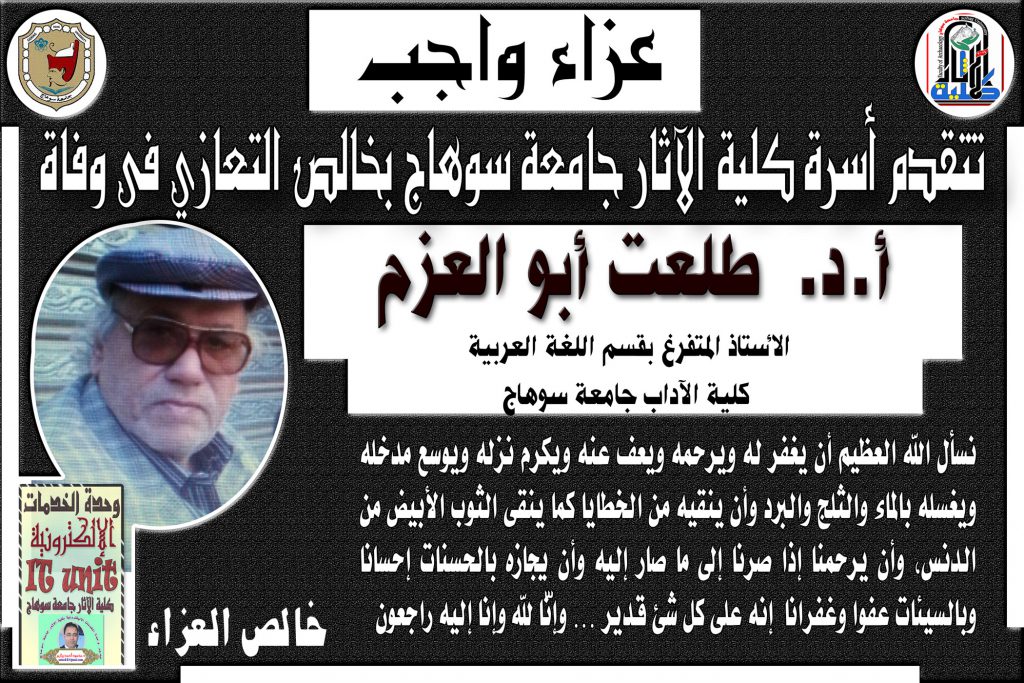 نشر على 16 نوفمبر، 2017نشر في أخبار الكلية،أخبار قسم الآثار الإسلامية،أخبار قسم الترميم،اخبار قسم الآثار المصرية تتقدم أسرة كلية الآثار بخالص التعازي فى وفاة أ.د. طلعت ابو العزم الأستاذ المتفرغ بقسم اللغة العربية كلية الآداب جامعة سوهاج تصفّح المقالات إعلان تعلن وحدة تطوير نظم تقويم الطلاب والامتحانات عن عقد ندوة للسادة معاوني أعضاء هيئة التدريس والطلابتعلن وحدة الأمن والسلامة عن عقد دورة عن الاسعافات الاولية يومي 19 و 20 / 11 / 2017م اترك تعليقاً إلغاء الردلن يتم نشر عنوان بريدك الإلكتروني. الحقول الإلزامية مشار إليها بـ *التعليق * الاسم * البريد الإلكتروني * الموقع الإلكتروني احفظ اسمي، بريدي الإلكتروني، والموقع الإلكتروني في هذا المتصفح لاستخدامها المرة المقبلة في تعليقي.