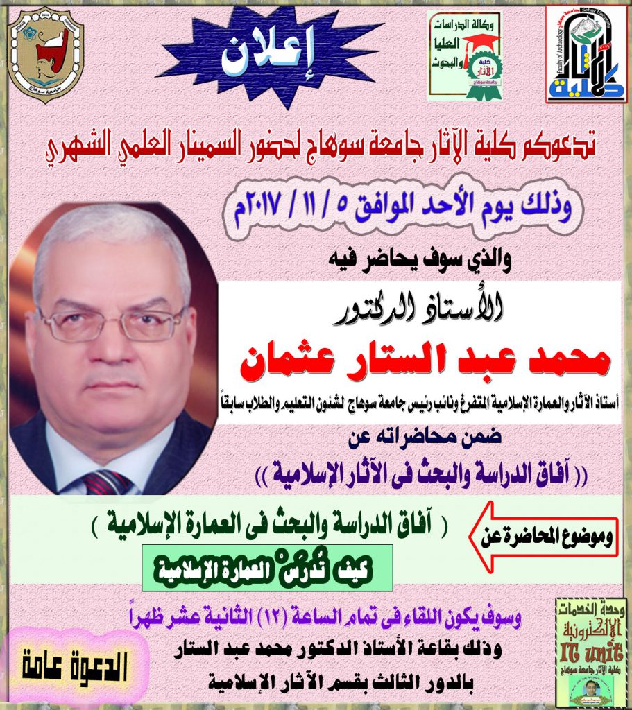 نشر على 31 أكتوبر، 2017نشر في أخبار الكلية،أخبار قسم الآثار الإسلامية،أخبار قسم الترميم،اخبار قسم الآثار المصرية تدعوكم كلية الآثار لحضور السمينار العلمي الشهري الذي سيحاضر فيه أ.د محمد عبد الستار عثمان عن (آفاق الدراسة والبحث فى العمارة الإسلامية) تصفّح المقالات أقيم حفل استقبال الطلاب الجدد والقدامى بكلية الآثار جامعة سوهاج يوم الأربعاء 25 / 10 / 2017مالسادة الأفاضل أعضاء هيئة التدريس والمدرسين المساعدين والمعيدين بكلية الآثار مدعوون لحضور اجتما السيد الستاذ الدكتور/ أحمد عزيز … رئيس الجامعة اترك تعليقاً إلغاء الردلن يتم نشر عنوان بريدك الإلكتروني. الحقول الإلزامية مشار إليها بـ *التعليق * الاسم * البريد الإلكتروني * الموقع الإلكتروني احفظ اسمي، بريدي الإلكتروني، والموقع الإلكتروني في هذا المتصفح لاستخدامها المرة المقبلة في تعليقي.