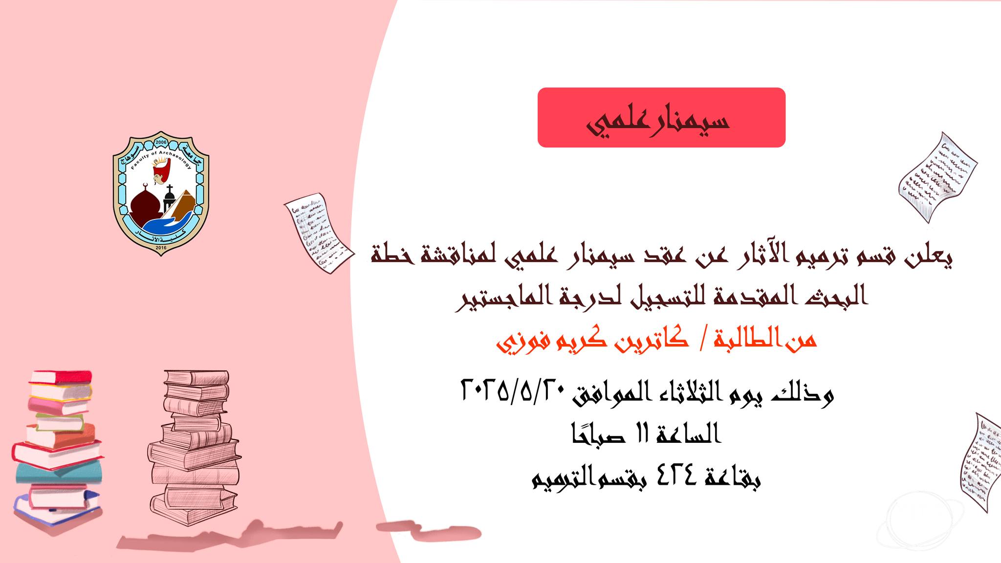 تدعوكم كلية الآثار وقسم ترميم الآثار لحضور السيمنار العلمي لمناقشة خطة البحث المقدمة للتسجيل لدرجة الماجستير