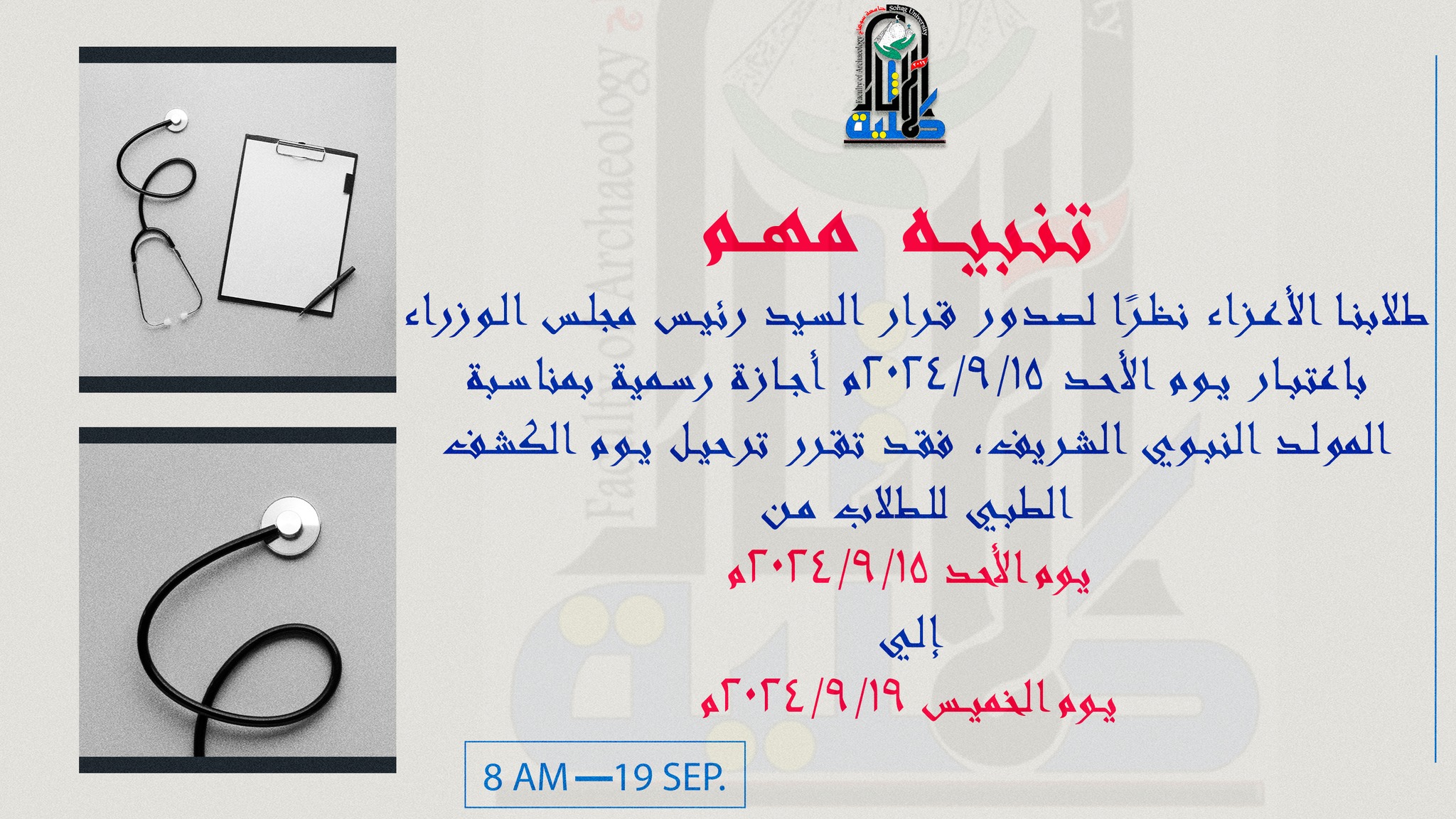 طلابنا الأعزاء نظرًا لصدور قرار السيد رئيس مجلس الوزراء باعتبار يوم الأحد 15/9/2024م أجازة رسمية بمناسبة المولد النبوي الشريف، فقد تقرر ترحيل يوم الكشف الطبي للطلاب من يوم الأحد 15/9/2024م إلي يوم الخميس 19/9/2024م