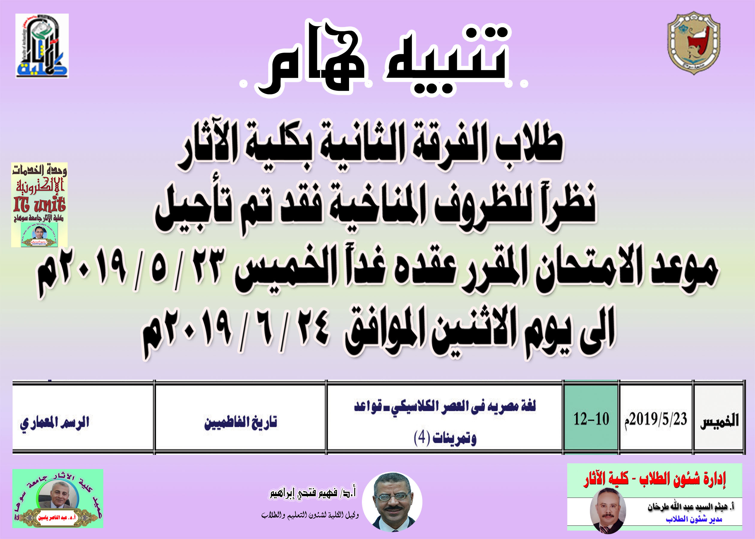 تنبيه هام :  طلاب الفرقة الثانية بكلية الآثار نظراً للظروف المناخية فقد تم تأجيل موعد الامتحان المقرر عقده غداً الخميس 23 / 5 / 2019م الى يوم الاثنين الموافق 24 / 6 / 2019م
