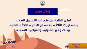 تُعلن الكلية عن فتح باب التسجيل للطلاب بالمستويات الثلاثة بالأقسام العلمية الثلاثة بالكلية