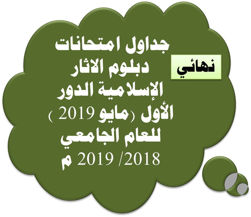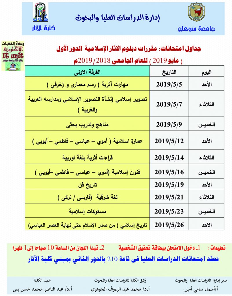 جداول امتحانات  دبلوم الاثار الإسلامية الدور الأول (مايو 2019 ) للعام الجامعي 2018/ 2019 م