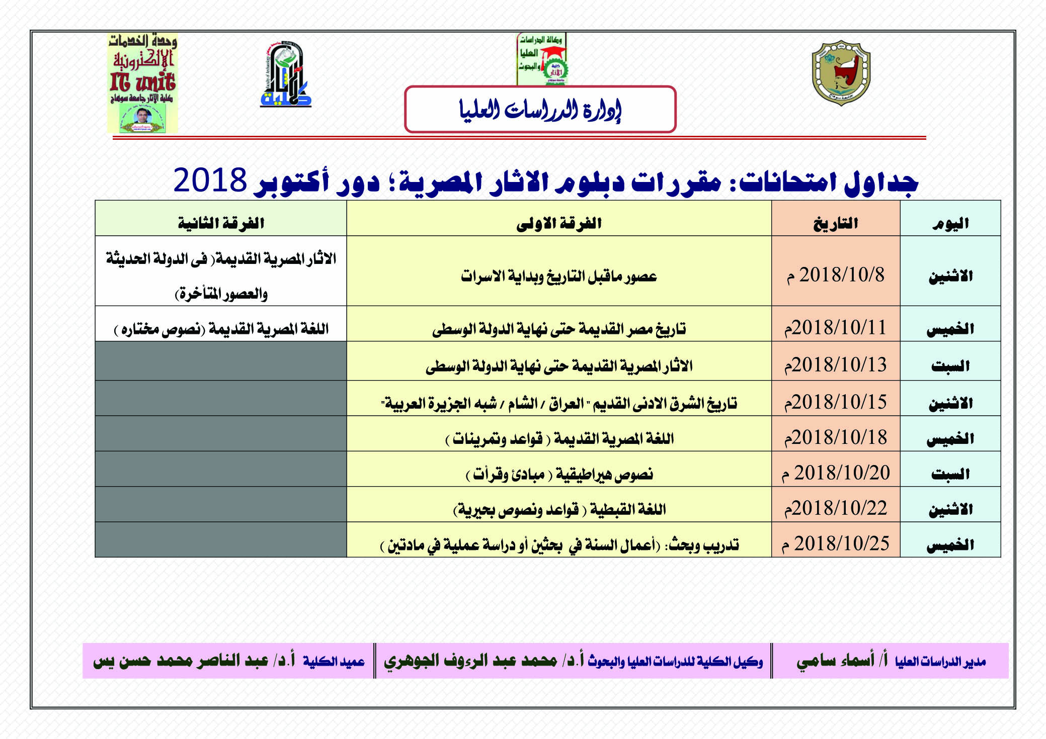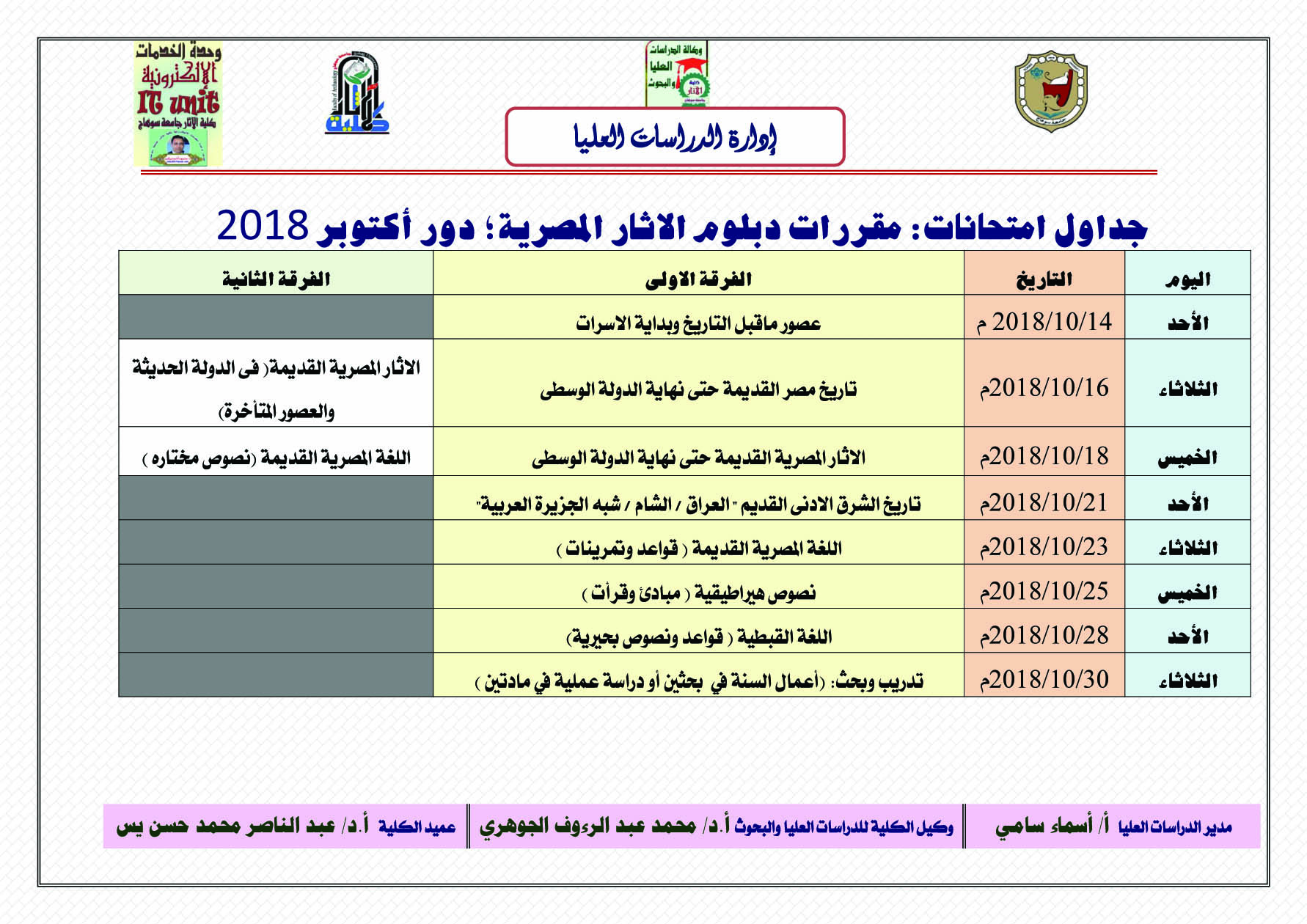 نشر على 24 سبتمبر، 2018نشر في أخبار الكلية،أخبار قسم الآثار الإسلامية،أخبار قسم الترميم،اخبار قسم الآثار المصرية http://staffsites.sohag-univ.edu.eg/stuff/advs/show/657?p=advs جداول امتحانات: دبلوم الاثار المصرية؛ دور أكتوبر 2018 تصفّح المقالات جداول امتحانات السنة التمهيدية دور اكتوبر 2018 مجدول محاضرات الفصل الدراسي الأول للعام الجامعي 2018 – 2019م، الفرقة الأولي – قسم الآثار المصرية كلية الآثار اترك تعليقاً إلغاء الردلن يتم نشر عنوان بريدك الإلكتروني. الحقول الإلزامية مشار إليها بـ *التعليق * الاسم * البريد الإلكتروني * الموقع الإلكتروني احفظ اسمي، بريدي الإلكتروني، والموقع الإلكتروني في هذا المتصفح لاستخدامها المرة المقبلة في تعليقي.