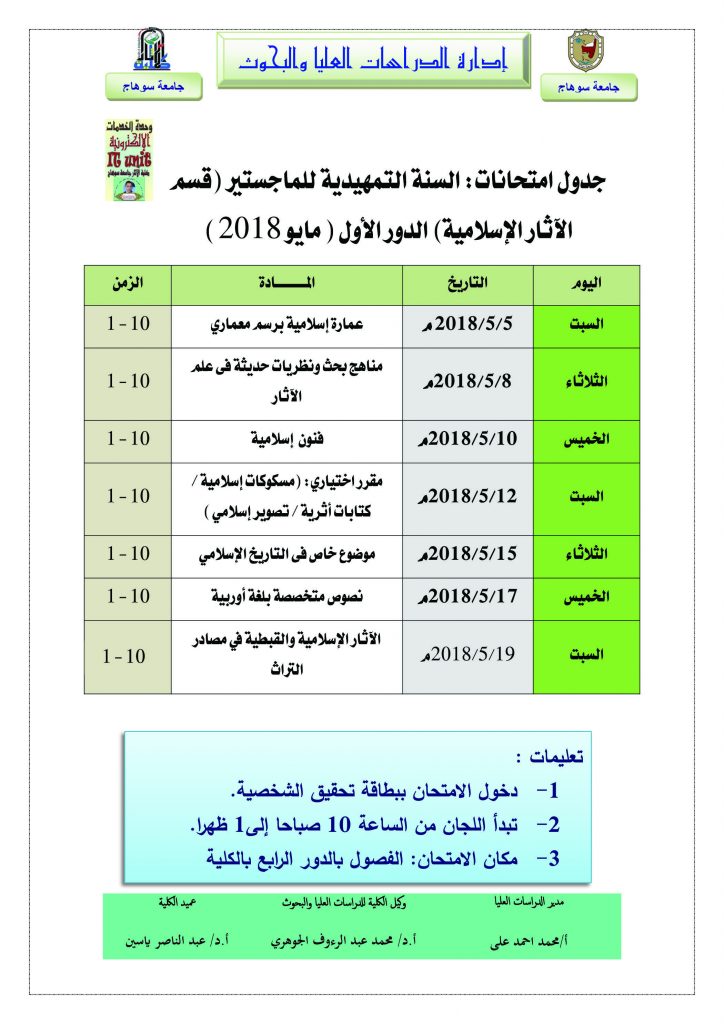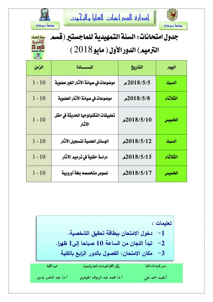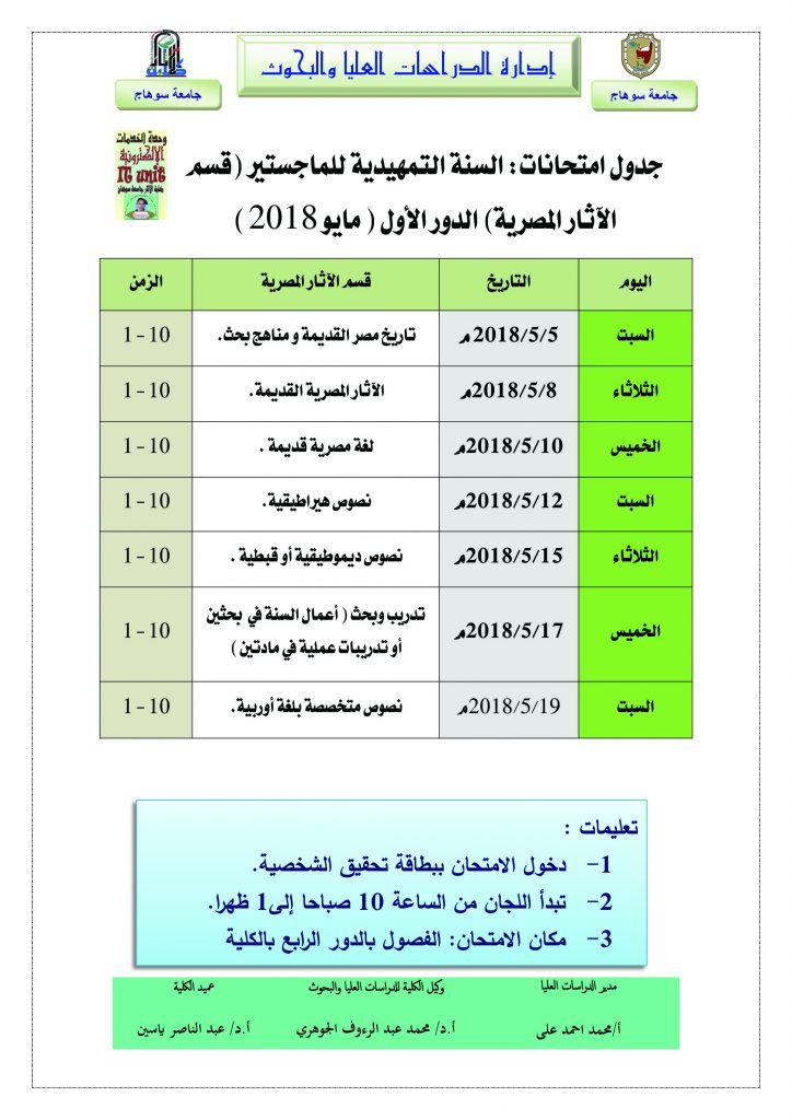 جدول امتحانات: السنة التمهيدية للماجستير الدور الأول ( مايو 2018 )