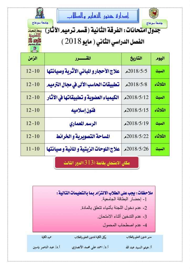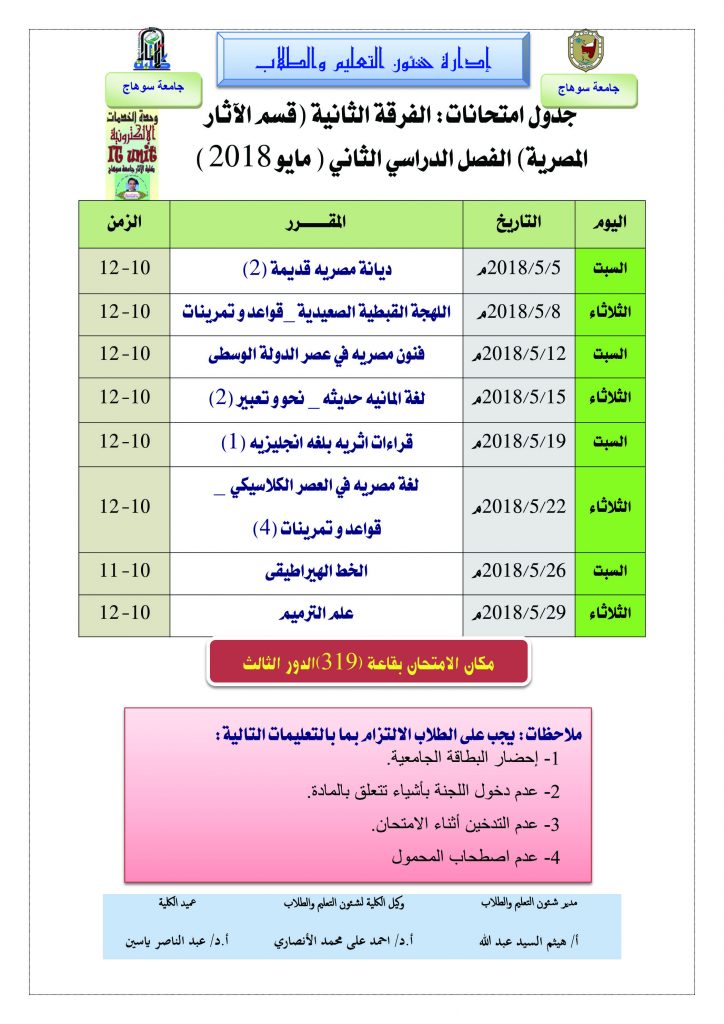 نشر على 23 أبريل، 2018نشر في أخبار الكلية،أخبار قسم الآثار الإسلامية،أخبار قسم الترميم،اخبار قسم الآثار المصرية ************************************** ***************************************** جدول امتحانات: الفرقة الثانية- الفصل الدراسي الثاني ( مايو 2018 ) تصفّح المقالات جدول امتحانات: الفرقة الأولى – الفصل الدراسي الثاني ( مايو 2018 )جدول امتحانات: السنة التمهيدية للماجستير الدور الأول ( مايو 2018 ) اترك تعليقاً إلغاء الردلن يتم نشر عنوان بريدك الإلكتروني. الحقول الإلزامية مشار إليها بـ *التعليق * الاسم * البريد الإلكتروني * الموقع الإلكتروني احفظ اسمي، بريدي الإلكتروني، والموقع الإلكتروني في هذا المتصفح لاستخدامها المرة المقبلة في تعليقي.