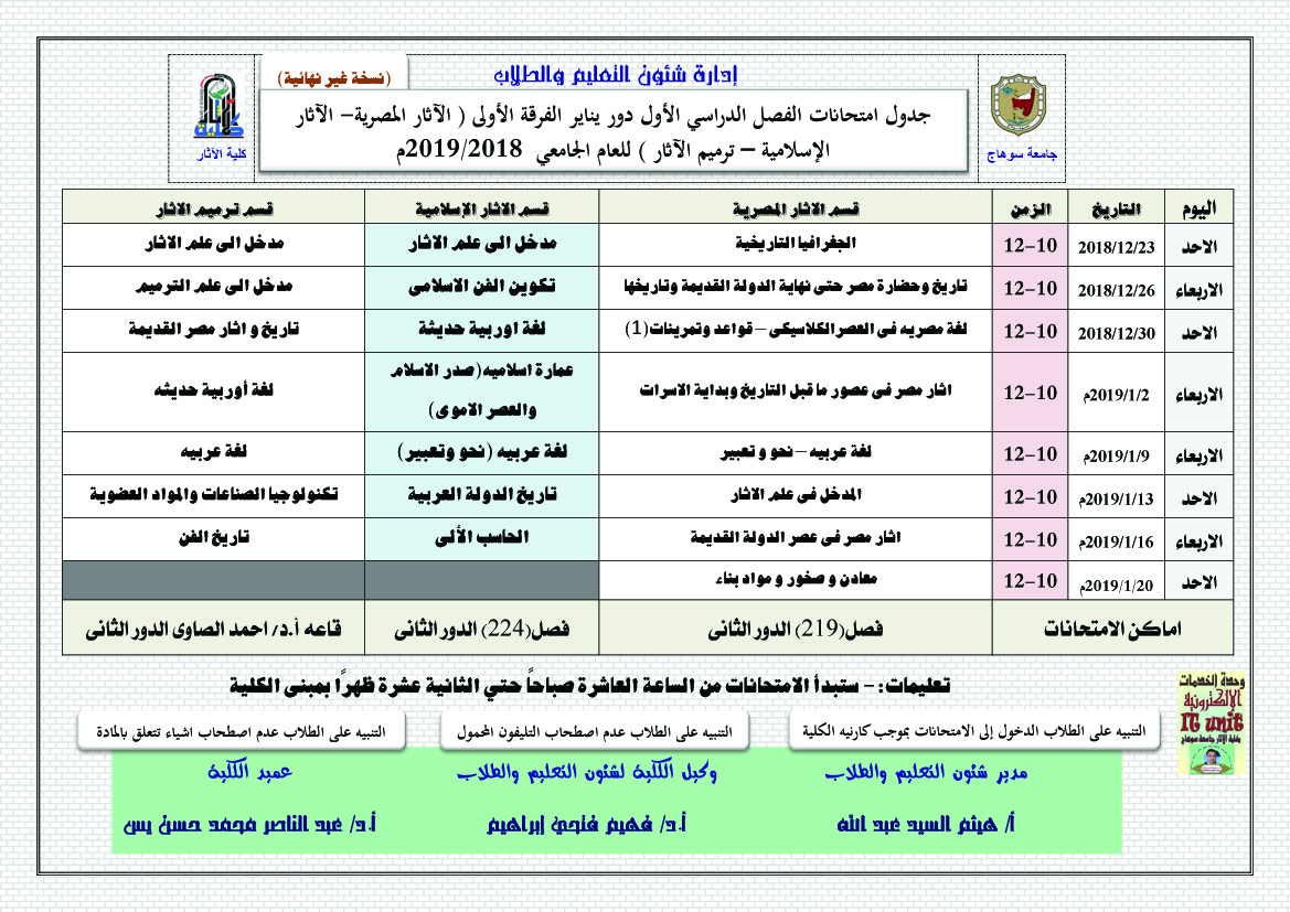 جدول امتحانات الفصل الدراسي الأول دور يناير الفرقة الأولى ( الآثار المصرية- الآثار الإسلامية – ترميم الآثار ) للعام الجامعي 2018/2019م (نسخة غير نهائية)