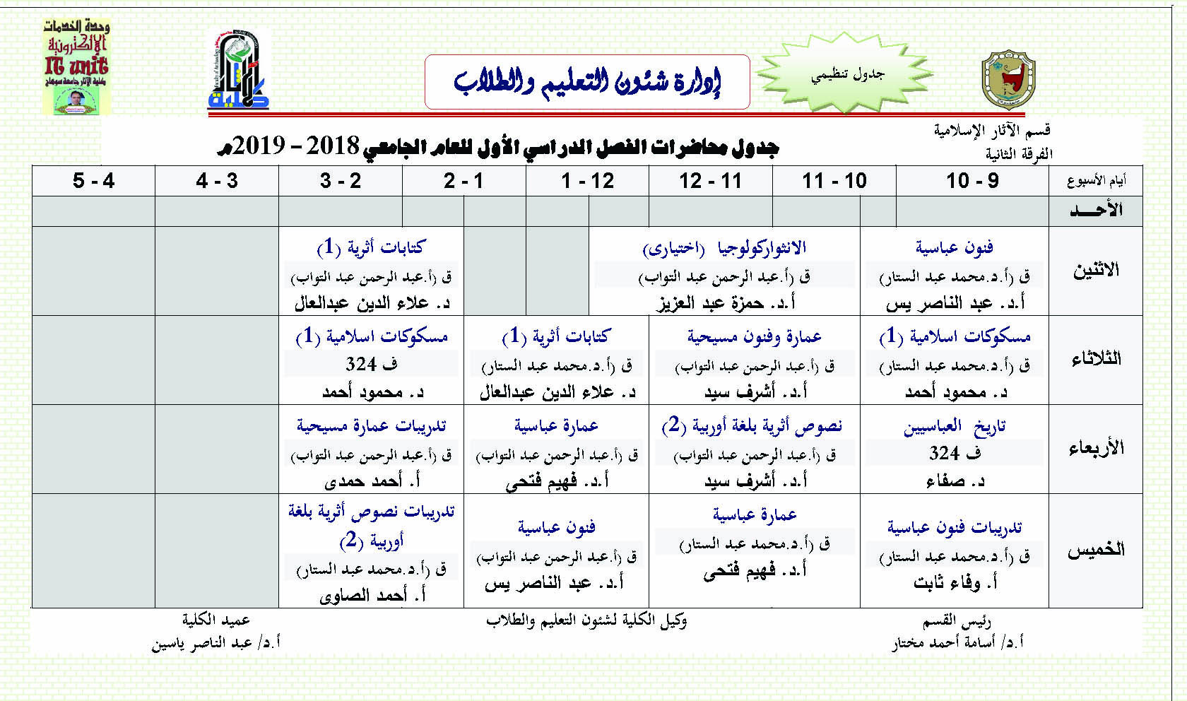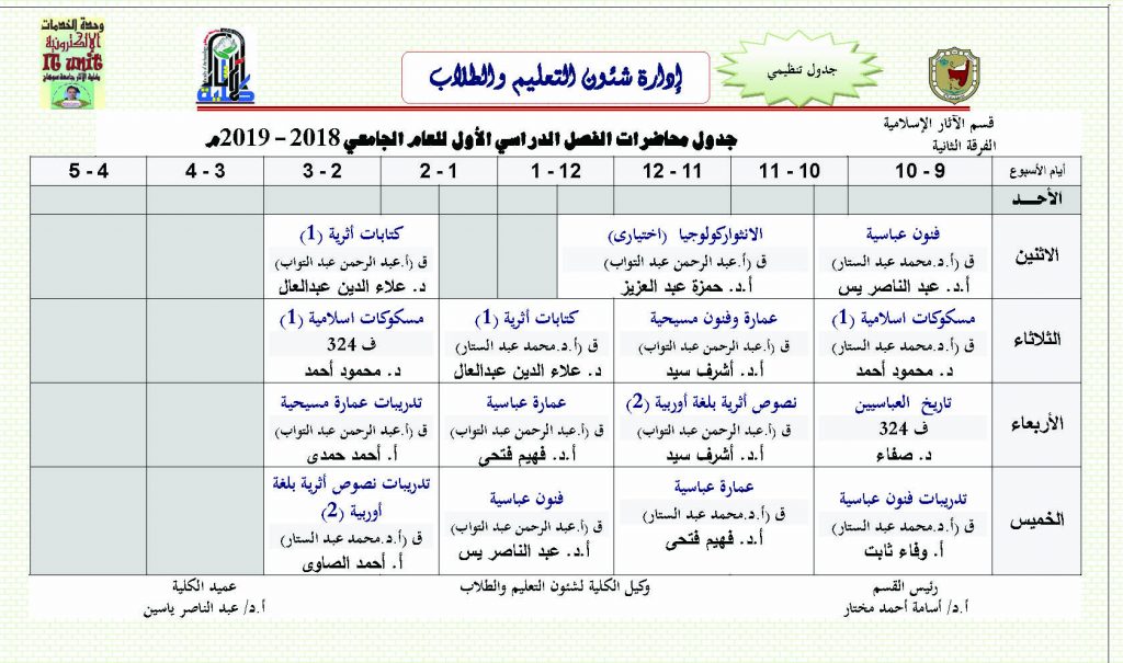 جدول محاضرات الفصل الدراسي الأول للعام الجامعي 2018 – 2019م، الفرقة الثانية- قسم الآثار الإسلامية كلية الآثار