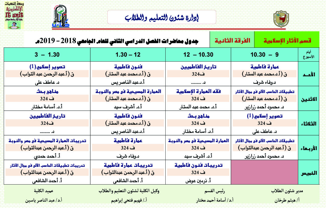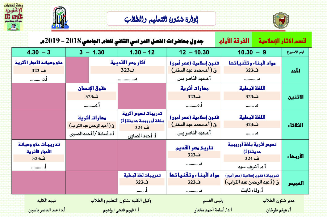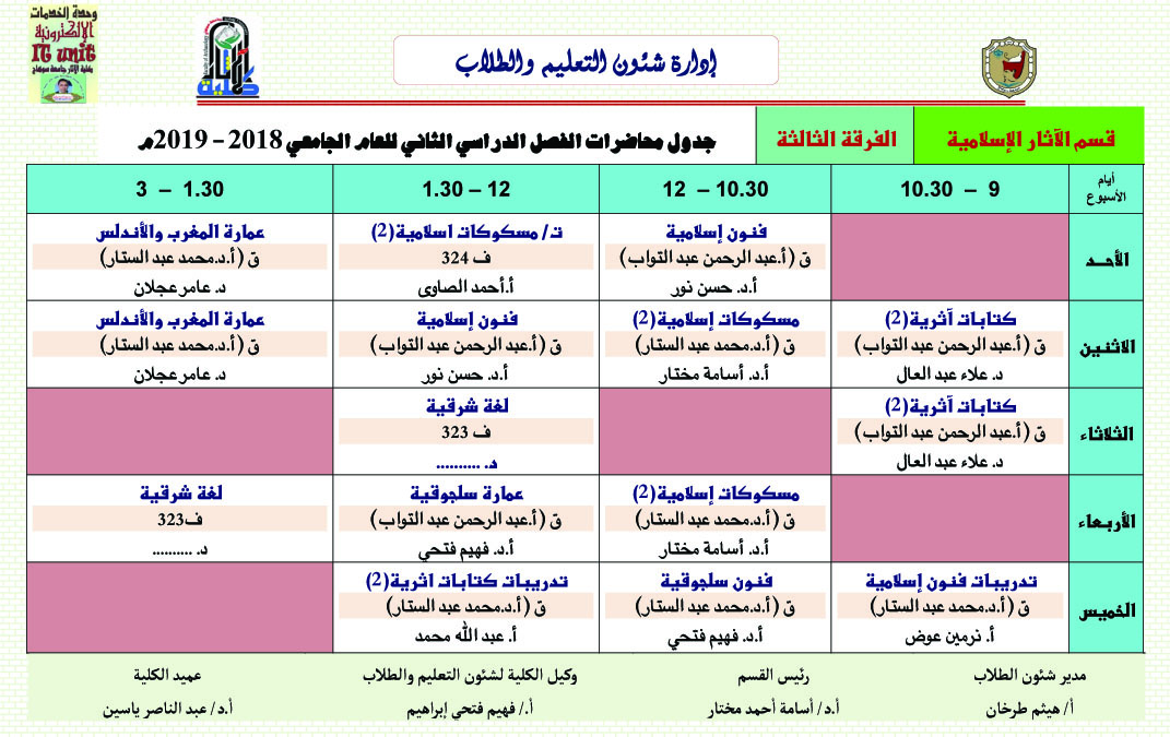 جدول محاضرات الفصل الدراسي الثاني ( قسم الآثار الإسلامية )للعام الجامعي 2018 – 2019م