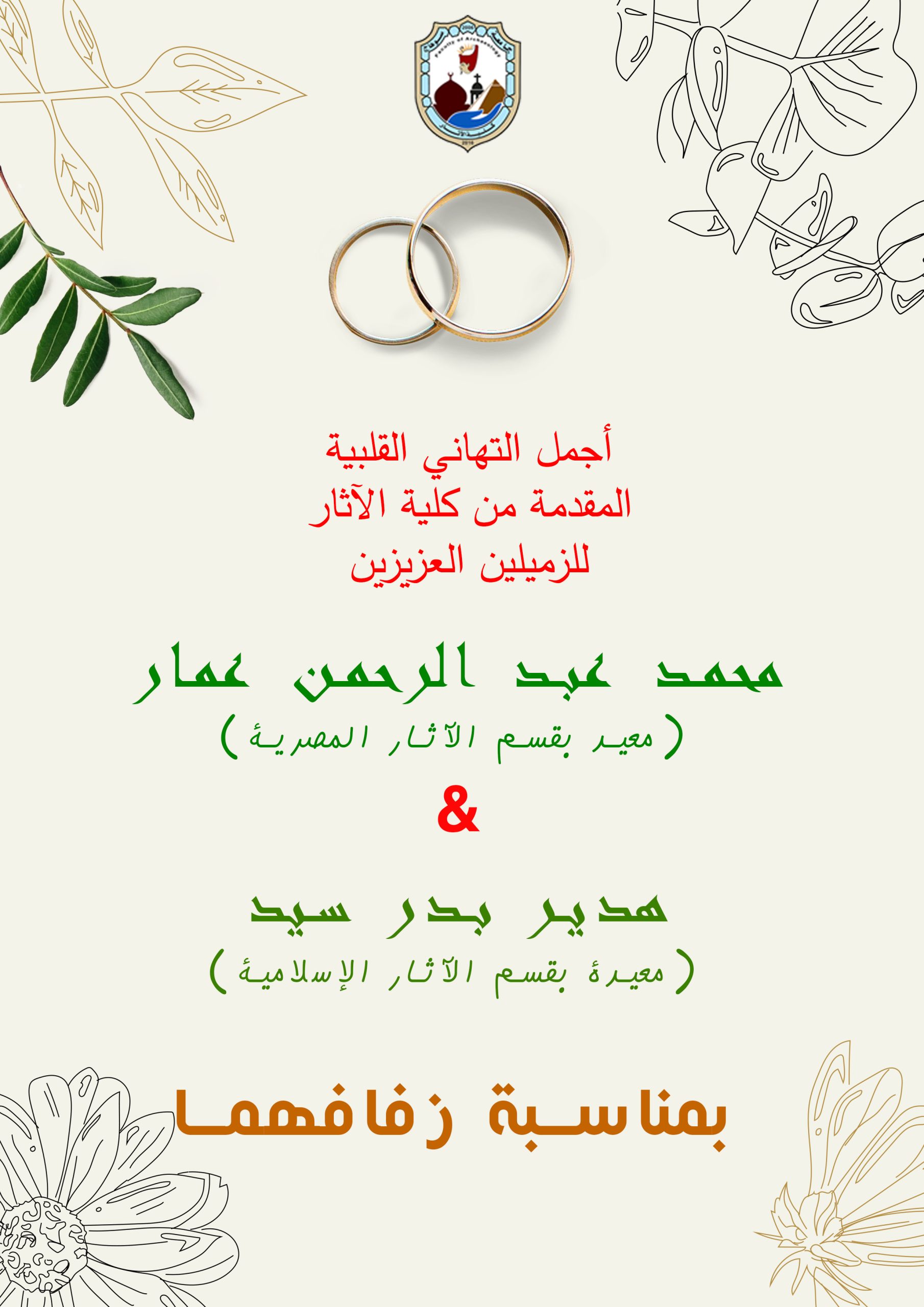 خالص التهاني القلبية للزميلين العزيزين: محمد عبد الرحمن عمار (معيد بقسم الآثار المصرية & هدير بدر سيد (معيدة بقسم الآثار الإسلامية) بمناسبة زفافهما السعيد