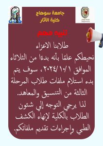 نشر على 29 سبتمبر، 2024نشر في أخبار الكلية دءًا من الثلاثاء الموافق 1/10/2024، سوف يتم بدء استلام ملفات طلاب المرحلة الثالثة من التنسيق والمعاهد تصفّح المقالات كلية الآثار ترحب بالطلاب الجدد والقدامي للعام الجامعي 2024/2025إعلان نتيجة الفصل الدراسي الصيفي للعام الجامعي 2023-2024 على منصة ZAD اترك تعليقاً إلغاء الردلن يتم نشر عنوان بريدك الإلكتروني. الحقول الإلزامية مشار إليها بـ *التعليق * الاسم * البريد الإلكتروني * الموقع الإلكتروني احفظ اسمي، بريدي الإلكتروني، والموقع الإلكتروني في هذا المتصفح لاستخدامها المرة المقبلة في تعليقي.
