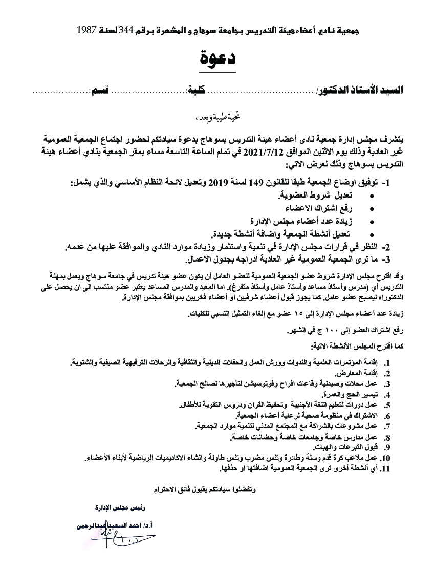 دعوة لحضور الجمعية العمومية غير العادية لنادي أعضاء هيئة التدريس يوم الاثنين 12 / 7 / 2021
