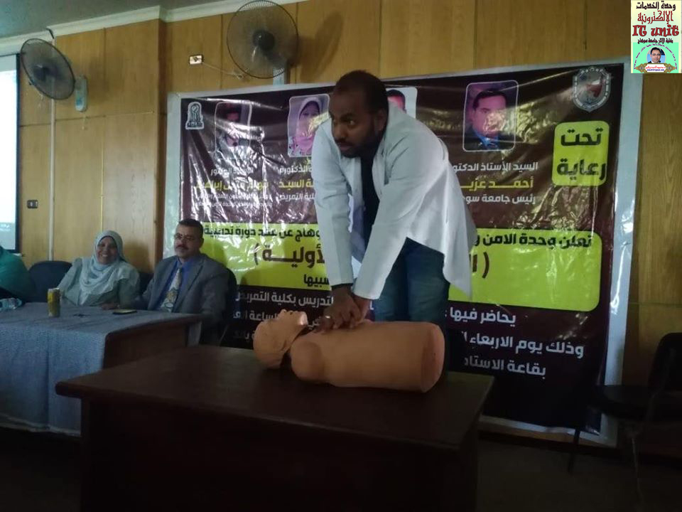 عُقد اليوم الأربعاء الموافق 27 / 11 / 2019م دورة الإسعافات الأوليه بكلية الآثار جامعة سوهاج، حاضر فيها مجموعة متميزة من أعضاء هيئة التدريس والهيئة المعاونة والطلاب بكلية التمريض، حيث تم شرح طرق الإسعاف الأولى للمرضى والمصابين بشكل علمي، كما تدريب الحضور على كيفية قياس الضغط وكيفية إعطاء الحقن لكافة المراحل العمرية …. وغيرها من أساليب الإسعاف المفيدة والضرورية للجميع، وكانت الاستفادة كبيرة من هذه الدورة حسث حضرها جمع كبير من أعضاء هيئة التدريس والموظفين وطلاب كلية الآثار…