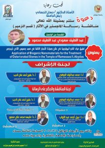 رسالة الماجستير الخاصة بالباحث / عبد اللطيف سعودي عبد اللطيف محمود، قسم ترميم الآثار بالكلية. والمعنوية ب “تطبيق مواد النانو البيولوجية في علاج وصيانة الأحجار التالفة في معبد رمسيس الثاني بأبيدوس”