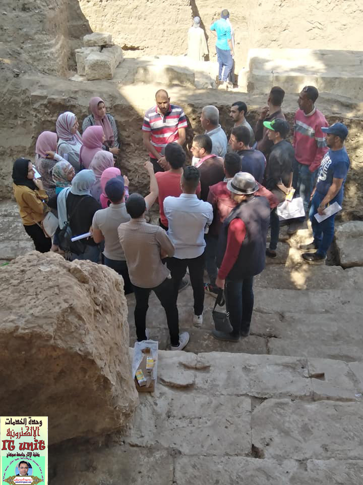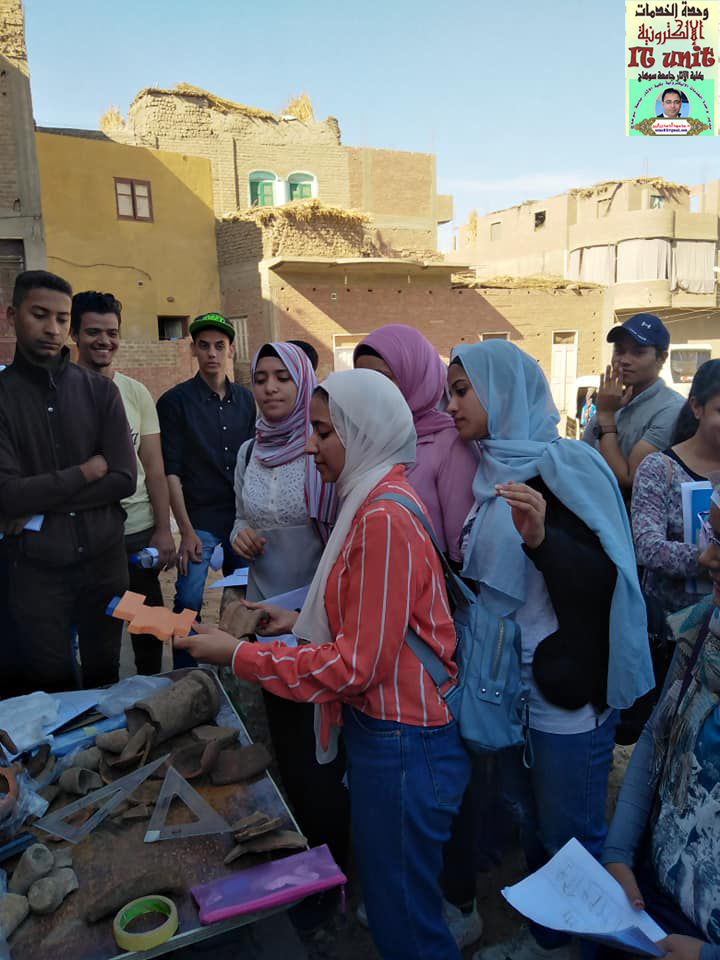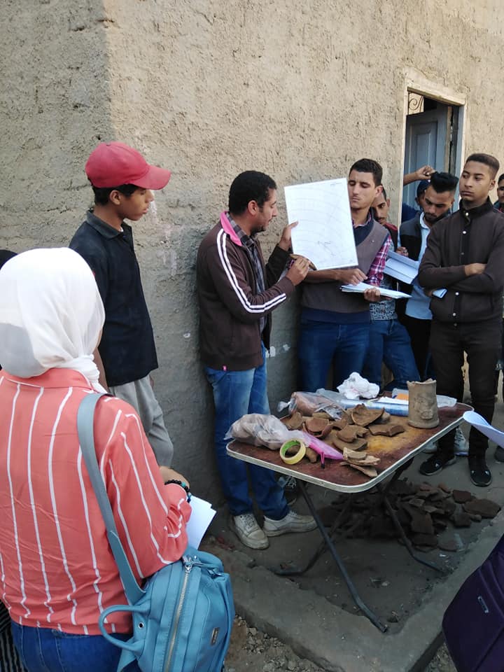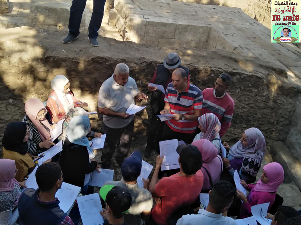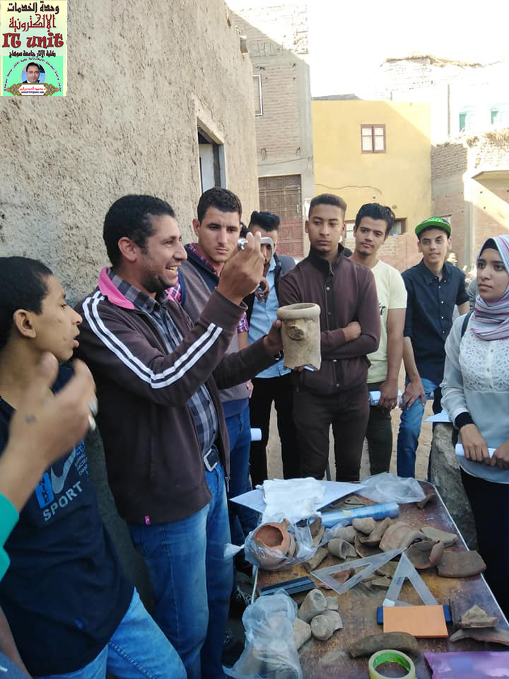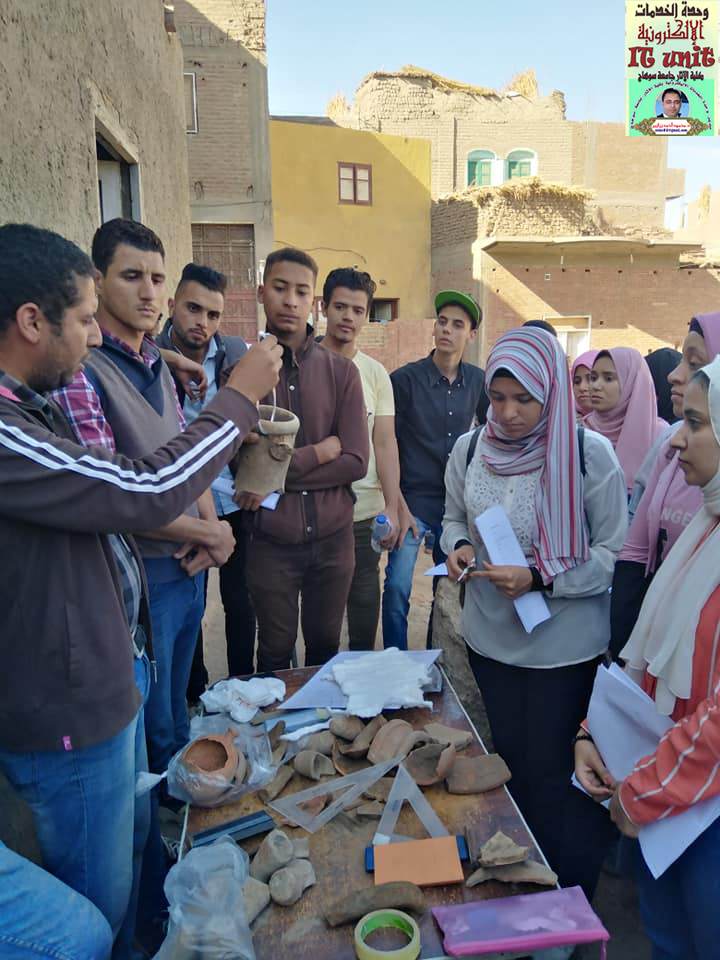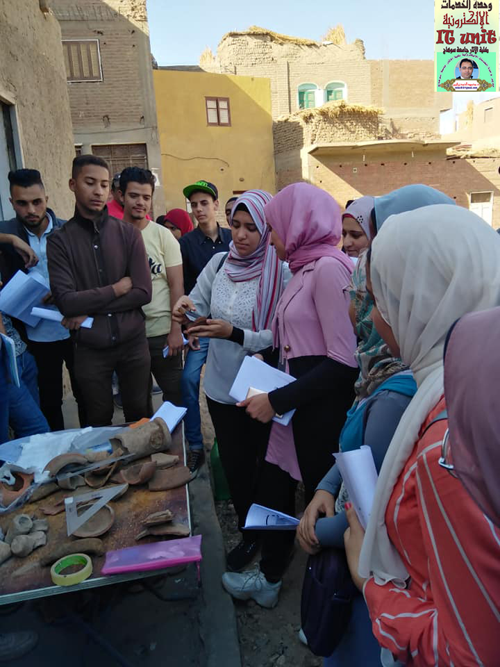 زيارة ميدانية لتدريب وتعريف طلاب الفرقة الرابعة بقسم الآثار المصرية على طرق الحفر وادوات الحفائر وكيفية عمل شبكة المربعات للموقع ورسم الفخار بمنطقة كوم اشقاو مركز طما