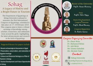 تعلن كلية الآثار عن عقد قسم الآثار المصرية للمؤتمر الدولي الأول للمصريّات، في الفترة من 17-18 فبراير 2025 في كلية الآثار، جامعة سوهاج. يهدف هذا المؤتمر إلى تعزيز تبادل المعرفة بين العلماء والباحثين والمهتمين من جميع أنحاء العالم، مع تسليط الضوء على أحدث التطورات والأبحاث في مجال المصريات.