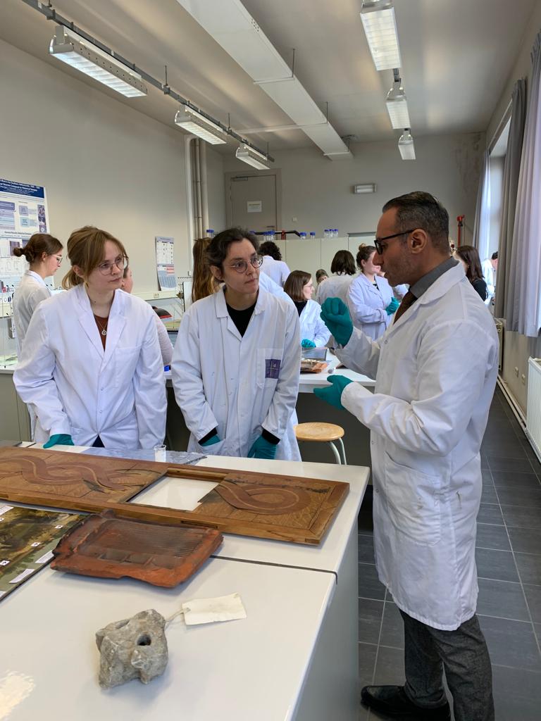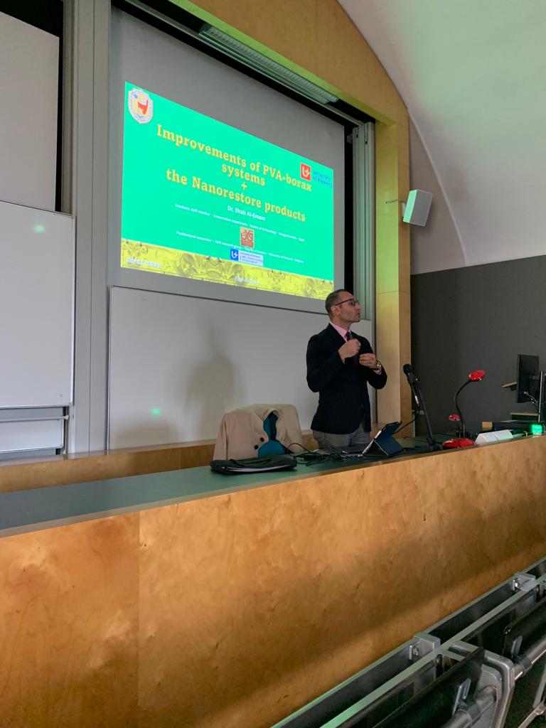 فقد قام سيادته بإلقاء محاضرات وتدريب طلاب الفرقة الثالثة على كيفية تحضير واستخدام هلام (جيل gel) كحول البولي فينيل-بوراكس في تنظيف الأسطح الأثرية المختلفة.