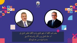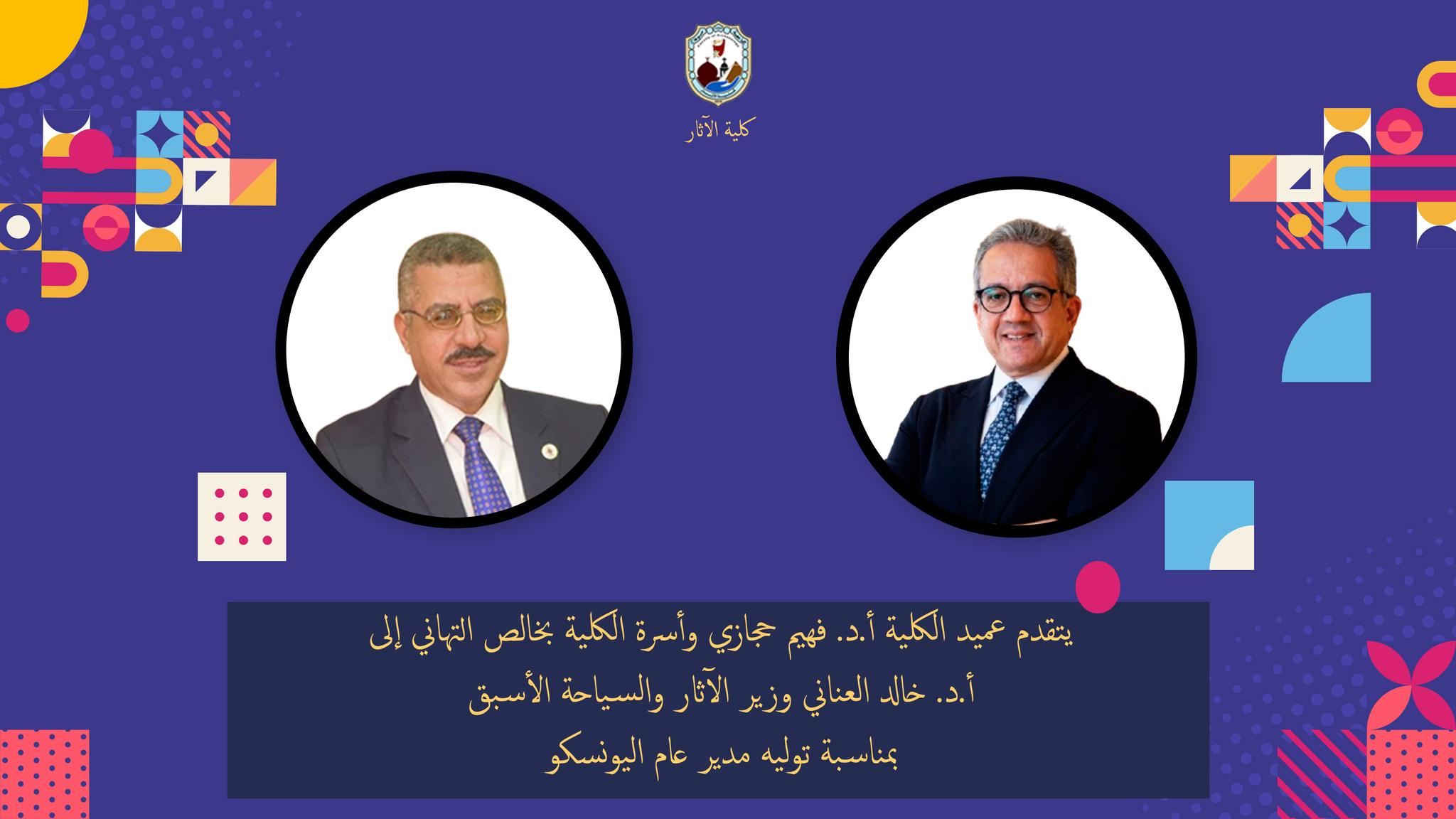 عميد الكلية أ.د. فهيم حجازي، وأسرة الكلية، بأسمى آيات التهاني وخالص التبريكات إلى معالي أ.د. خالد العناني – وزير السياحة والآثار الأسبق – بمناسبة اختياره مديرًا عامًا لمنظمة اليونسكو
