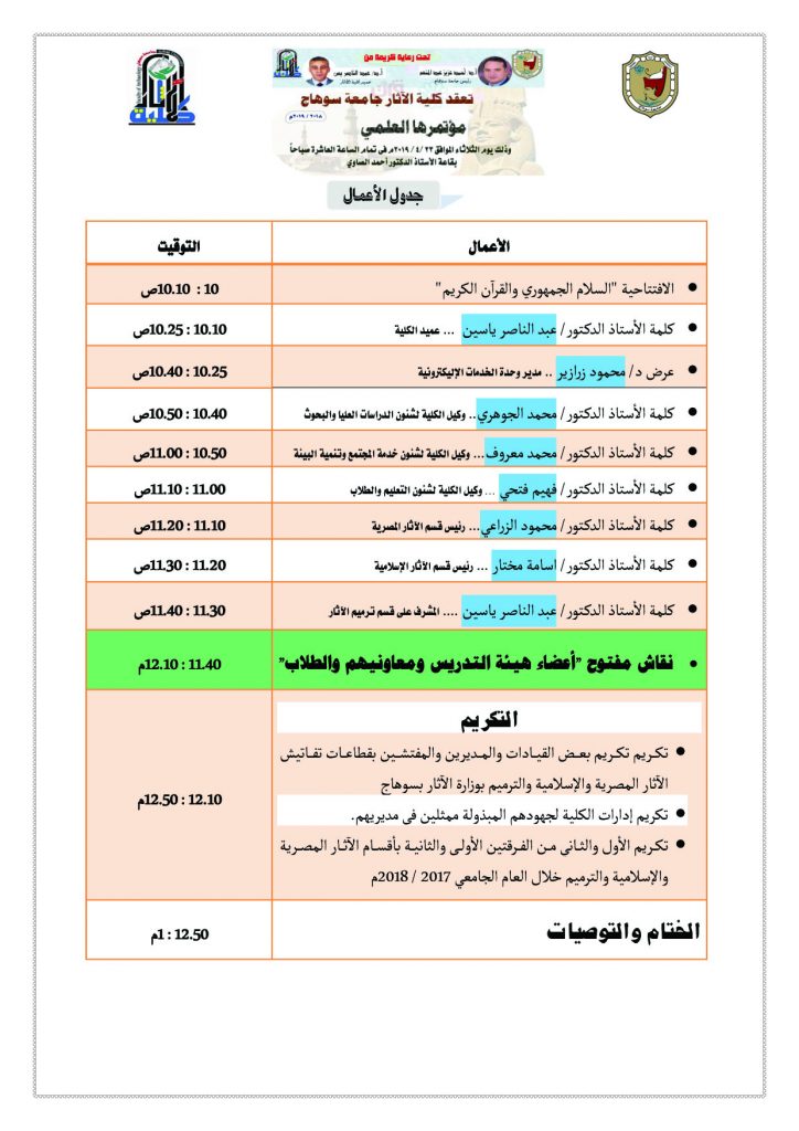 مؤتمر كلية الاثار جامعة سوهاج وجدول أعماله وقائمة بالمكرمين فيه