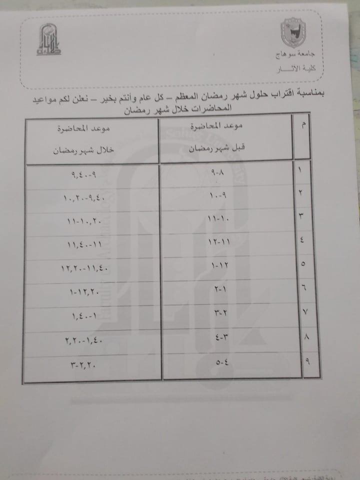 نشر على 31 مارس، 2022نشر في أخبار الكلية،أخبار قسم الآثار الإسلامية،أخبار قسم الترميم،اخبار قسم الآثار المصرية مواعيد المحاضرات خلال شهر رمضان الكريم تصفّح المقالات مسابقة القرآن الكريمتهنئة للدكتور إبراهيم ساويرس لترقيته أستاذ مساعد اترك تعليقاً إلغاء الردلن يتم نشر عنوان بريدك الإلكتروني. الحقول الإلزامية مشار إليها بـ *التعليق * الاسم * البريد الإلكتروني * الموقع الإلكتروني احفظ اسمي، بريدي الإلكتروني، والموقع الإلكتروني في هذا المتصفح لاستخدامها المرة المقبلة في تعليقي.