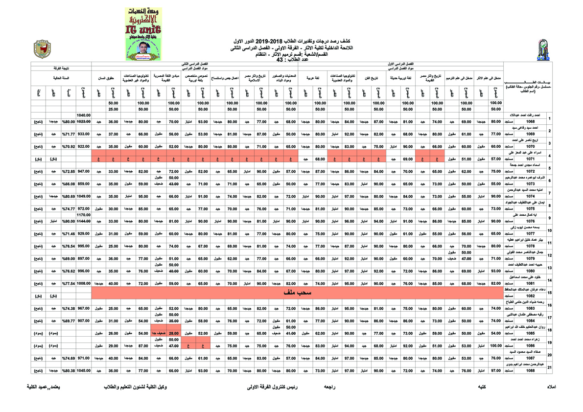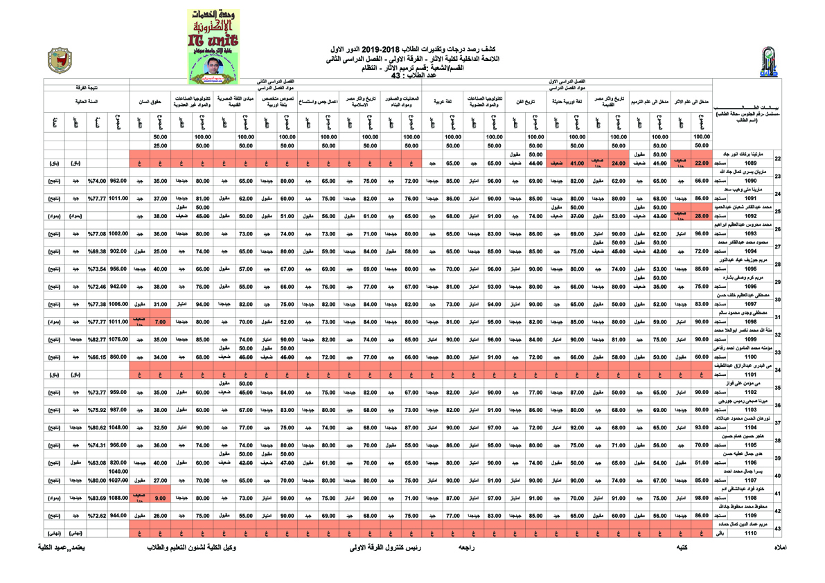 نتيجة الفرقة الأولى قسم ترميم الآثار الفصل الدراسي الثاني من العام الجامعي 2018 / 2019م