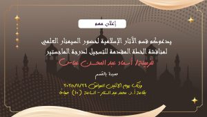يدعوكم قسم الآثار الإسلامية لحضور السيمنار العلمي لمناقشة الخطة المقدمة للتسجيل لدرجة الماجستير للزميلة/ أسماء عبد المحسن عباس معيدة بالقسم