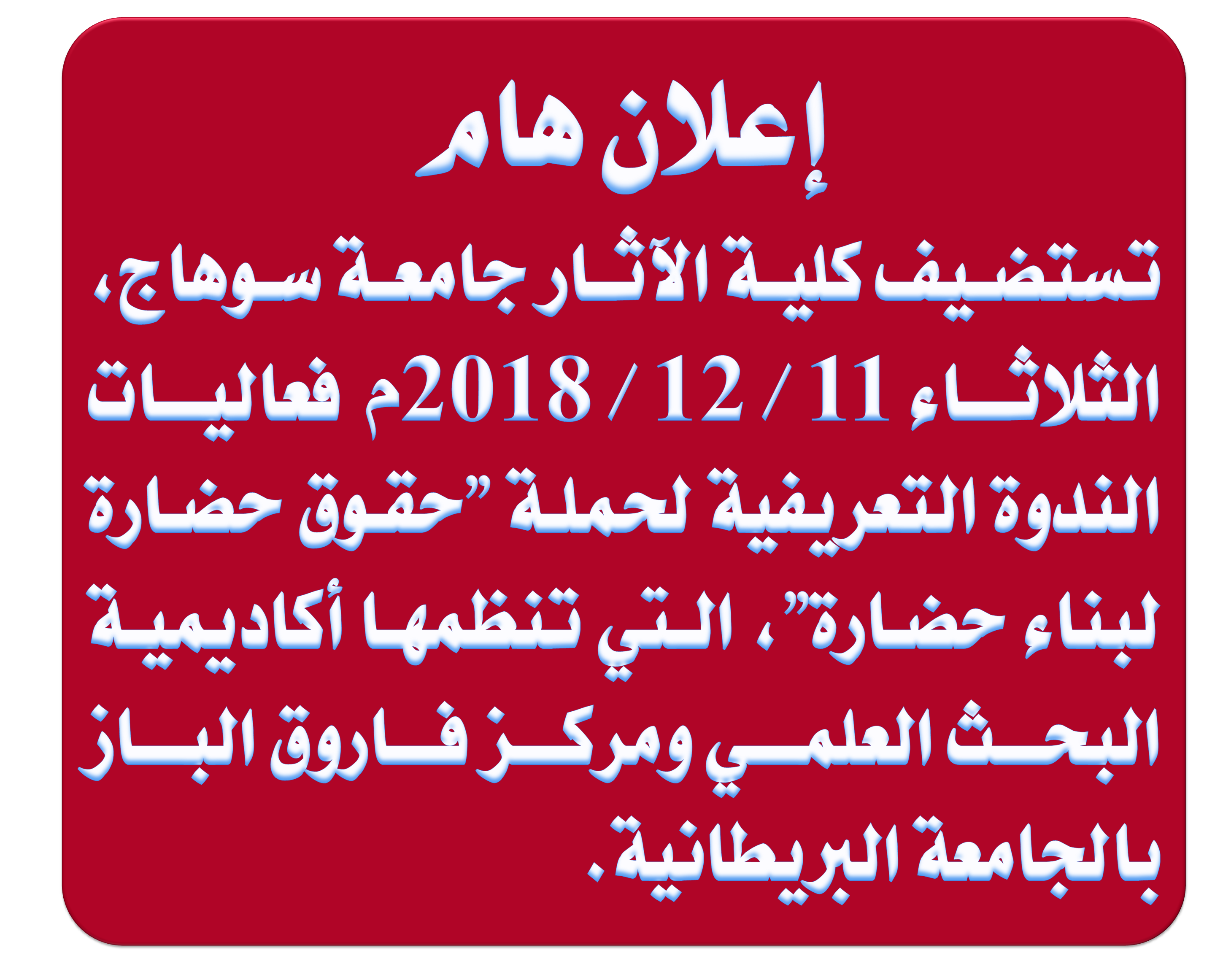 تستضيف كلية الآثار جامعة سوهاج، الثلاثاء 11 / 12 / 2018م فعاليات الندوة التعريفية لحملة “حقوق حضارة لبناء حضارة”، التي تنظمها أكاديمية البحث العلمي ومركز فاروق الباز بالجامعة البريطانية.